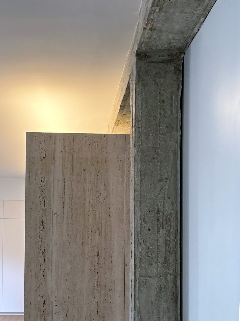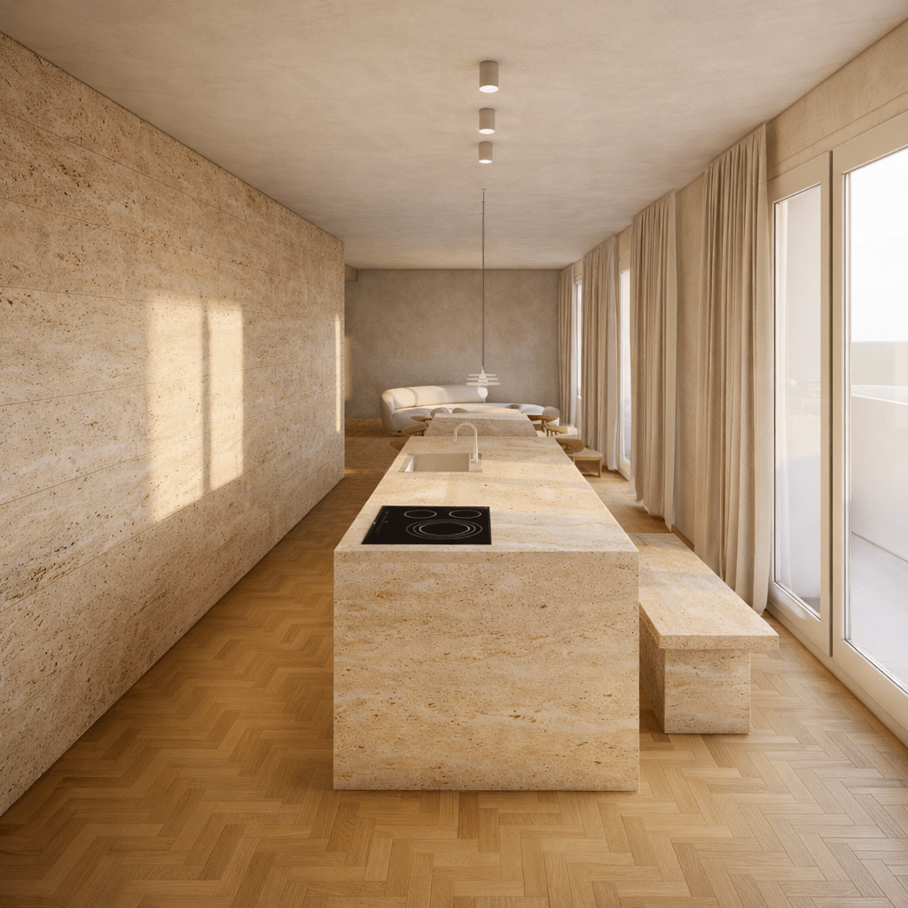 The kitchen and dining area are unified by a bespoke 5-meter-long travertine feature, combining functionality with material elegance. The interplay of raw concrete and the warmth of natural stone creates a refined yet grounded atmosphere, balancing openness and intimacy throughout the home.