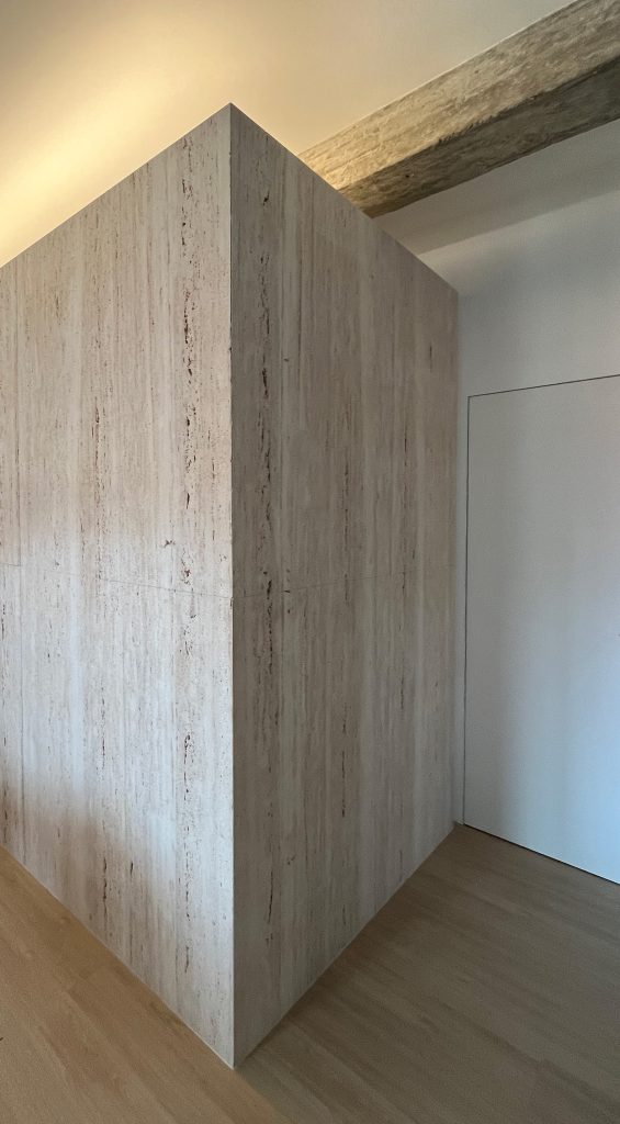 The project organizes the bedrooms around a courtyard, with three rooms strategically placed along its perimeter to maximize light and privacy. At the core of the design lies a travertine-clad box that contains two bathrooms, serving as both a functional element and an architectural centerpiece. This box defines the spatial hierarchy of the living room by being displayed at a lower level than the ceiling height, subtly delineating the space while exposing the concrete beams above.