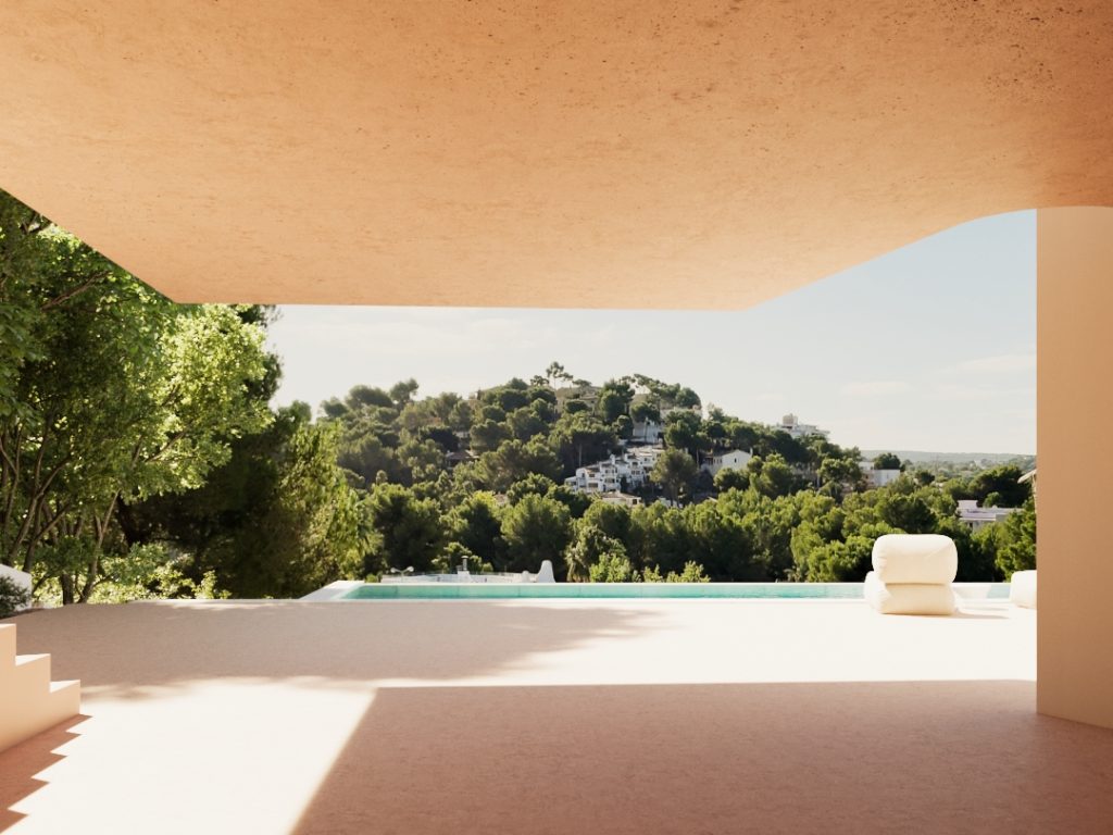 The project addresses these challenges with a single curved volume, designed to avoid cutting any of the original trees. The new structure is open to frame the distant landscape views and cantilevers to create a shaded porch that connects with the pool, providing a space to enjoy the Mediterranean climate throughout the summer.