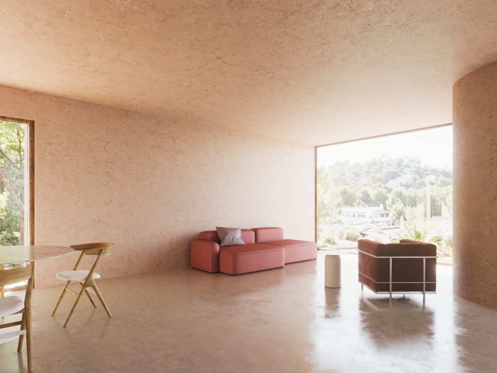 The plot in Costa de la Calma, Mallorca, is home to numerous pine trees and native vegetation, along with a small white house from the 1970s, featuring a gable roof finished with traditional Arabic tiles, and a series of walkable exterior paths made from local marés stone.