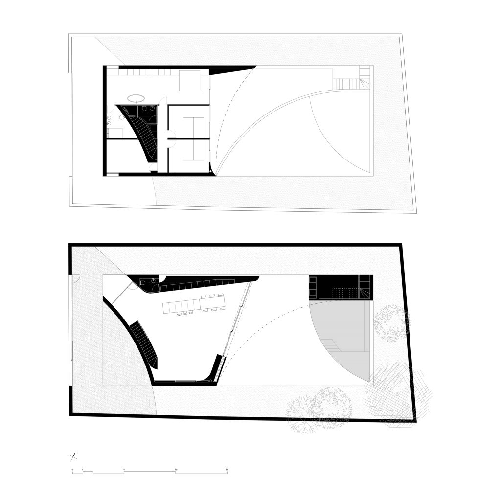A sculptural porch marks the entrance, acting as both threshold and connector. Its concave side shelters parking, while the convex side embraces the stair to the upper floor. The interplay of curved walls creates a sense of openness, guiding the view through the interior toward the garden and expanding the perception of space.