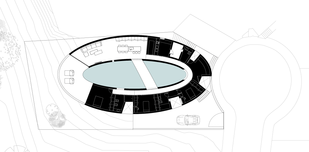 The distance from the immediate context allowed us to envision an independent and powerful volume. As the interior program was arranged, the geometry of the project naturally evolved into an elliptical floor plan—a form that brings character, fluidity, and harmony. This decision also opened the possibility of incorporating a second elliptical gesture at the heart of the house: an interior courtyard that not only introduces natural light into all living spaces but also becomes a central visual and atmospheric focus.